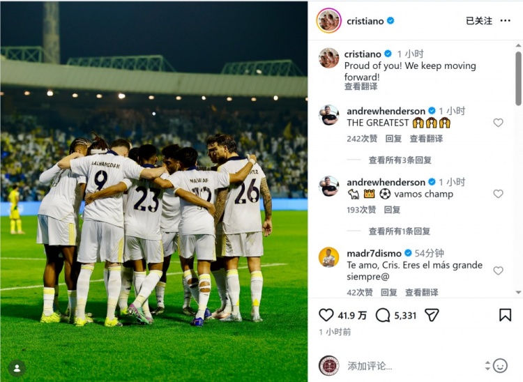因伤缺席!C罗社媒庆祝球队取胜:为你们感到骄傲,我们继续前进