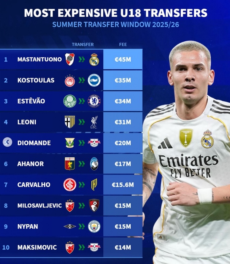 app下载-德转发布U18球员今夏转会身价排行:马斯坦托诺榜首,埃斯特旺与莱奥尼上榜