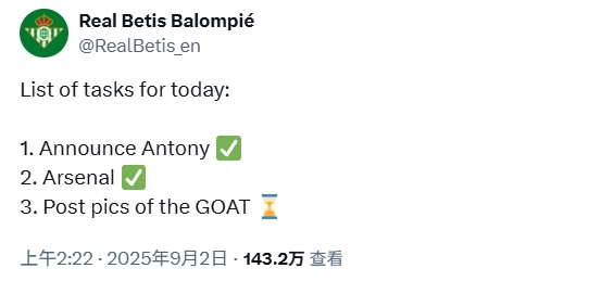 贝蒂斯官方推特幽默回应:率先确认安东尼加盟,随后祝贺阿森纳位列次席 byxiaoqiao 发表于2025年09月08日 9月2日讯 西甲皇家贝蒂斯俱乐部于今日凌晨正式宣布安东尼转会消息,其英文官方社媒在发布公告时,还幽默地向阿森纳俱乐部发出调侃。贝蒂斯官推在一条推送中表示:今日待办事项:1. 官宣安东尼✅2. 提阿森纳✅3. 发GOAT图片⌛ 你可能感兴趣的内容 上一篇文章 官方网站-国安深夜发声:全队就0比6失利深表歉意,向球迷郑重致歉 发表于2025年09月08日 byxiaoqiao 查看文章 下一篇文章 在线入口-卢教练盛赞四大NBA球星:爱德华兹、塔图姆、库里与欧文 发表于2025年09月08日 byxiaoqiao 查看文章 你可能会喜欢