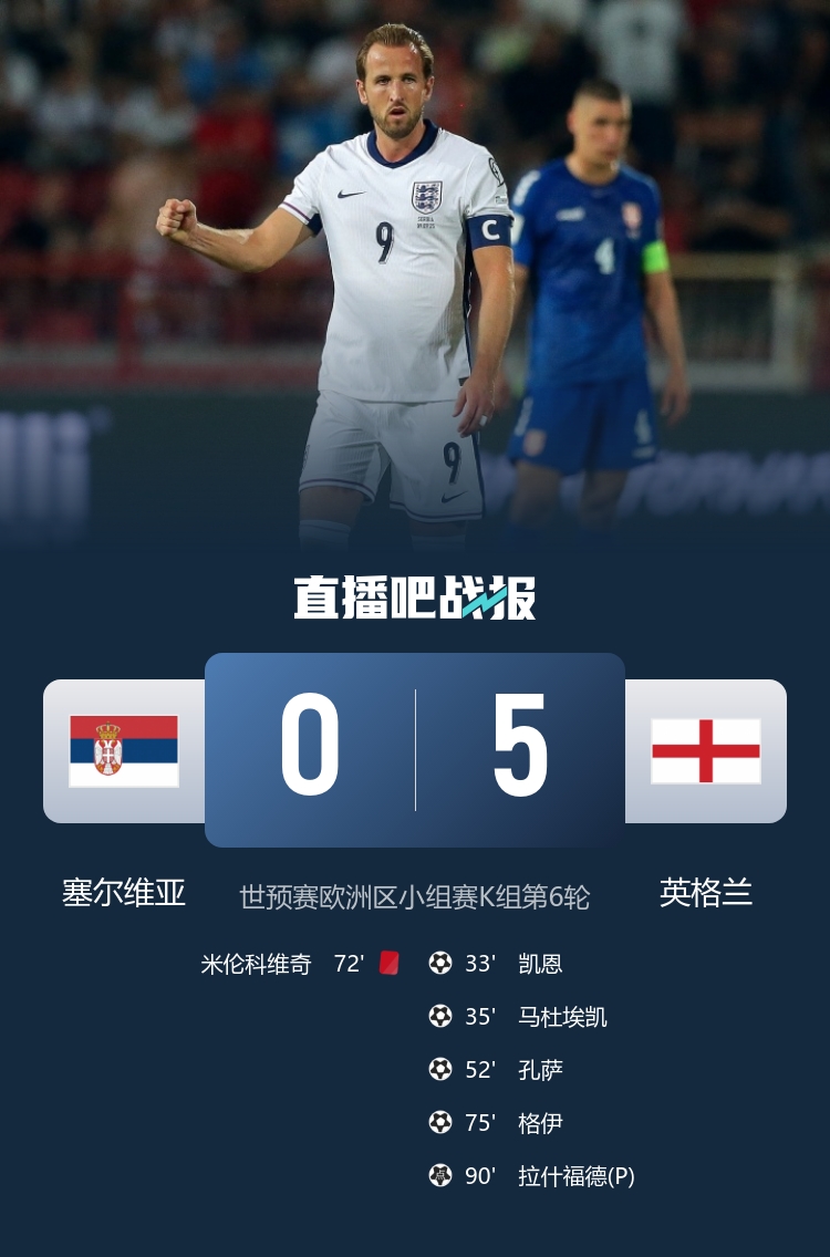 英格兰5-0横扫十人塞尔维亚,凯恩破门赖斯两助格伊传射
